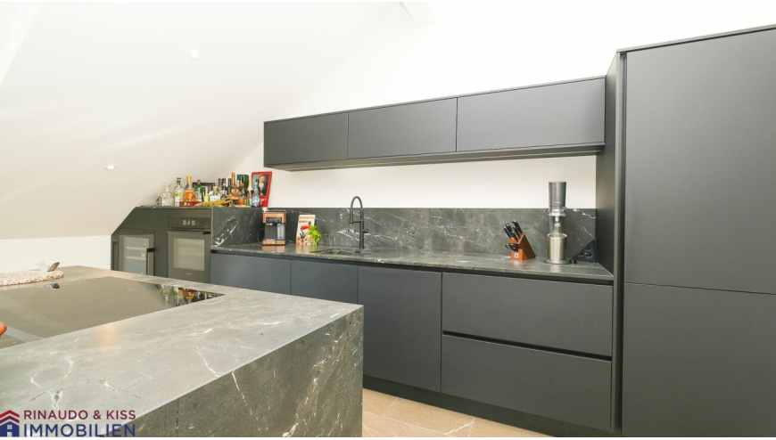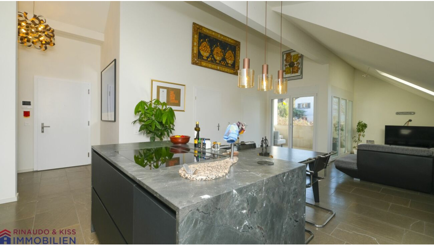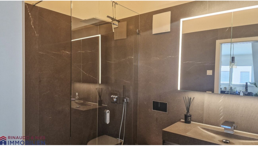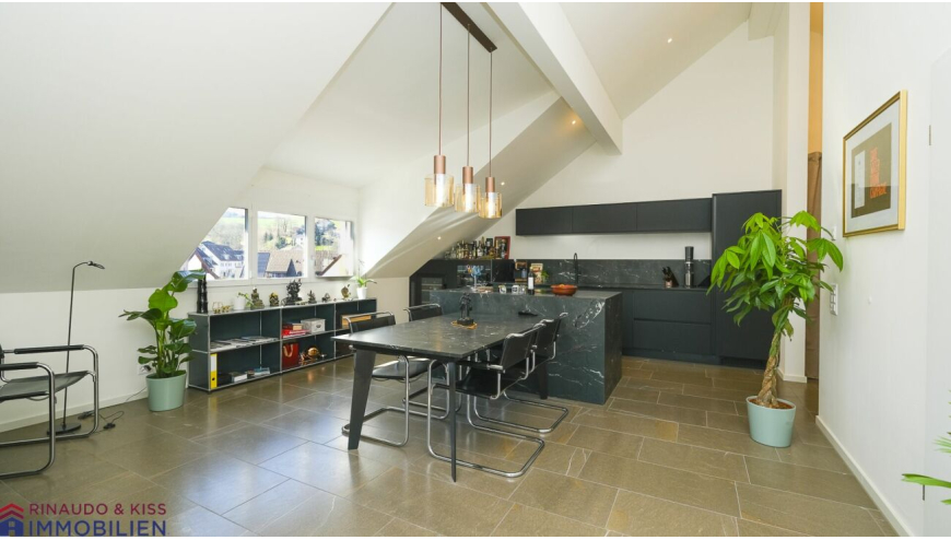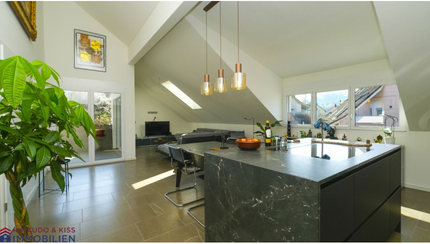 Die zum Verkauf ausgeschriebene Dachwohnung ist geräumig und verfügt über einen klug konzipierten und gut möblierbaren, wohnlichen Grundriss. Der Wohnbereich ist bis zum Dachgiebel offen und bietet eine überdurchschnittliche Raumhöhe. Teils bodentiefe Fenster sorgen für ein angenehmes, helles und grosszügiges Wohngefühl. Der natürliche Baustoff Holz und Naturstein prägt das Ambiente, innen wie aussen. Der Innenausbau ist sehr hochwertig. Farb- und Materialkonzept sind ideal aufeinander abgestimmt. Luft-Wasser-Wärmepumpe, Aussenwärmedämmung sowie Bodenheizung sorgen für ein nachhaltig gutes Klima.