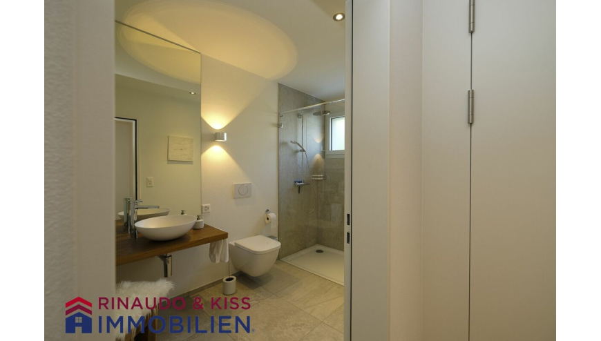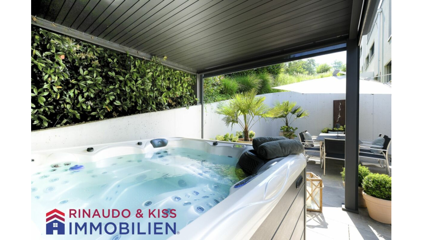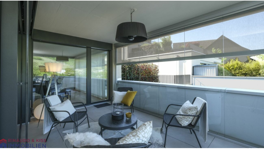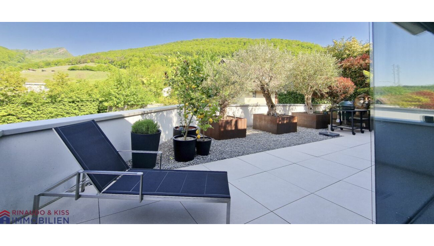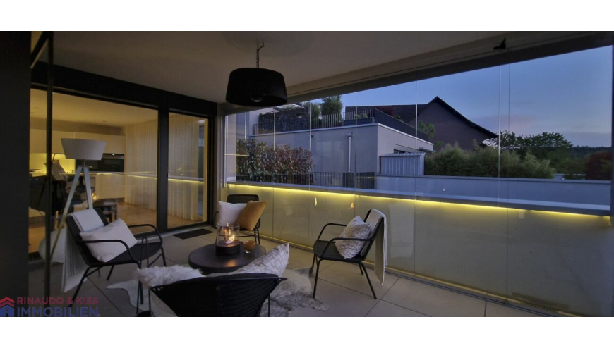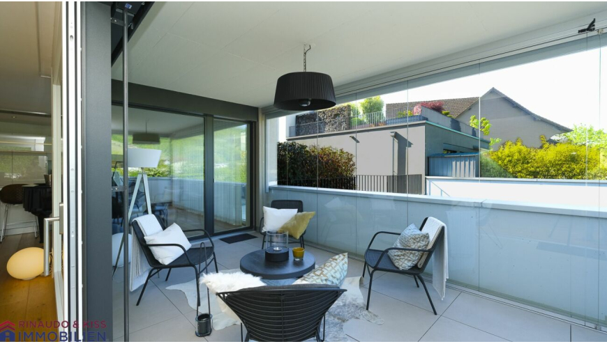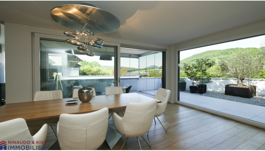 Exklusives Wohnen mit geschützter, sonniger Wellnessterrasse. Der nach hinten versetzte Aussenbereich mit Whirlpool garantiert Ihnen viel Privatsphäre und absolute Ferienstimmung. Traumhafte Aussichtslage in Richtung Wasserflue und Küttiger Weinreben.