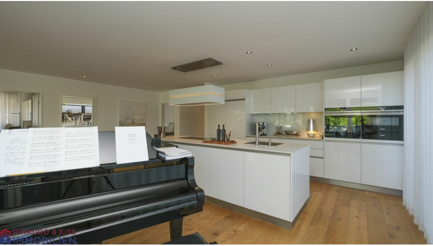 Die Küche ist mit eleganten Glasfronten und modernen Geräten ausgestattet und lässt keine Wünsche offen.