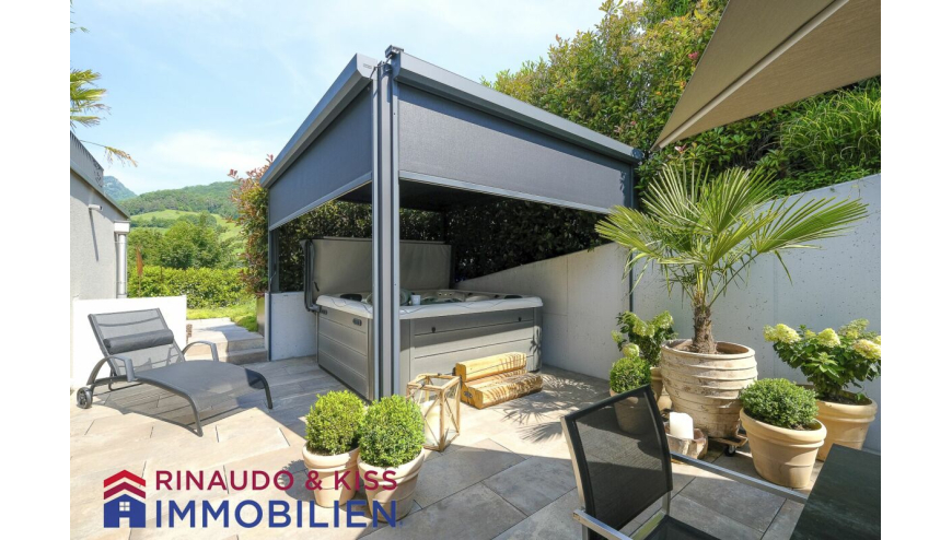 Das absolute Highlight ist die Wellness-Terrasse. Dieser Aussenbereich ist weit nach Hinten versetzt und geschützt vor unerwünschten Blicken. Hier geniessen Sie die Ruhe, die Aussicht und abwechslungsweise die Sonne und den angenehmen Schatten. In diesem geschützten Bereich können Sie den Whirlpool ungestört nutzen.