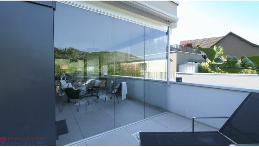 Exklusives Wohnen mit geschützter, sonniger Wellnessterrasse. Der nach hinten versetzte Aussenbereich mit Whirlpool garantiert Ihnen viel Privatsphäre und absolute Ferienstimmung. Traumhafte Aussichtslage in Richtung Wasserflue und Küttiger Weinreben.