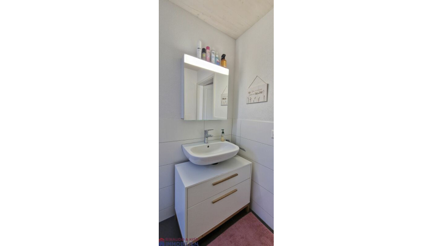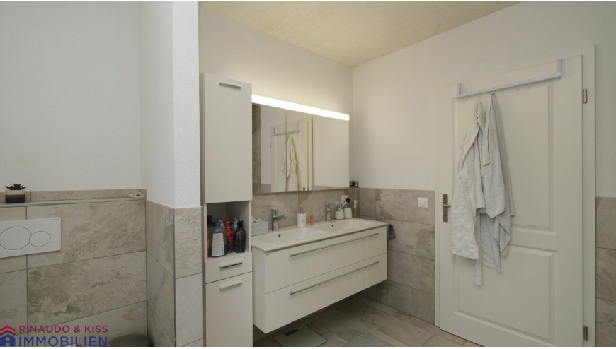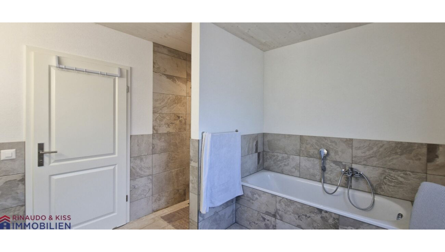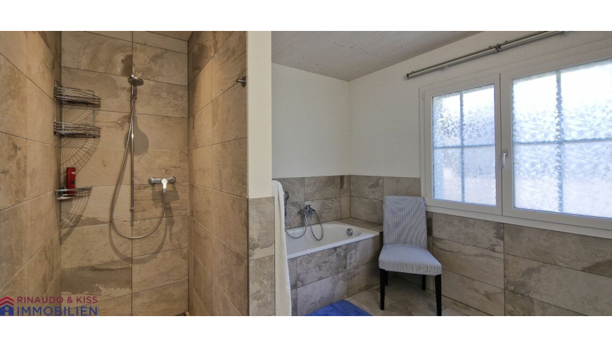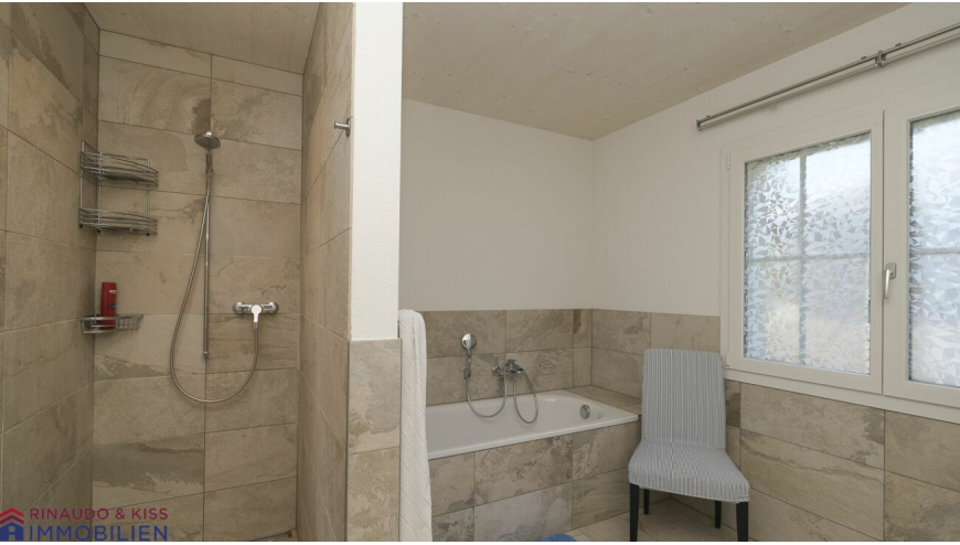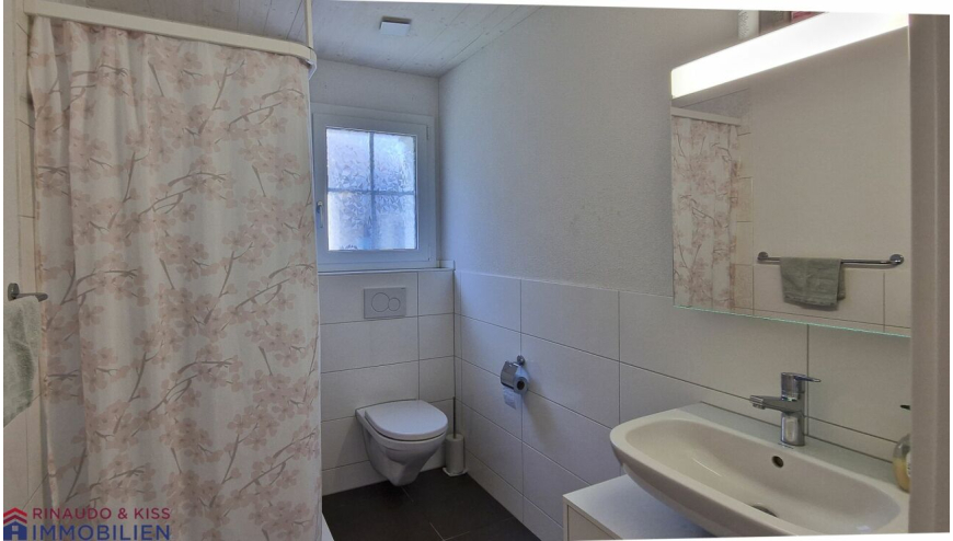 Insgesamt verfügt die Liegenschaft über zwei Nasszellen. Ein grosses Badezimmer mit Dusche und Badewanne im Dachgeschoss und ein WC mit Dusche im Erdgeschoss.