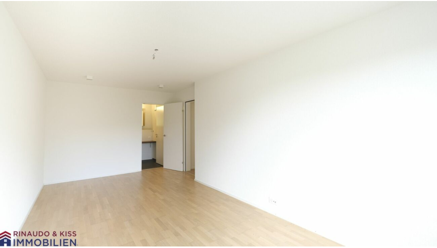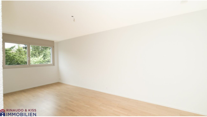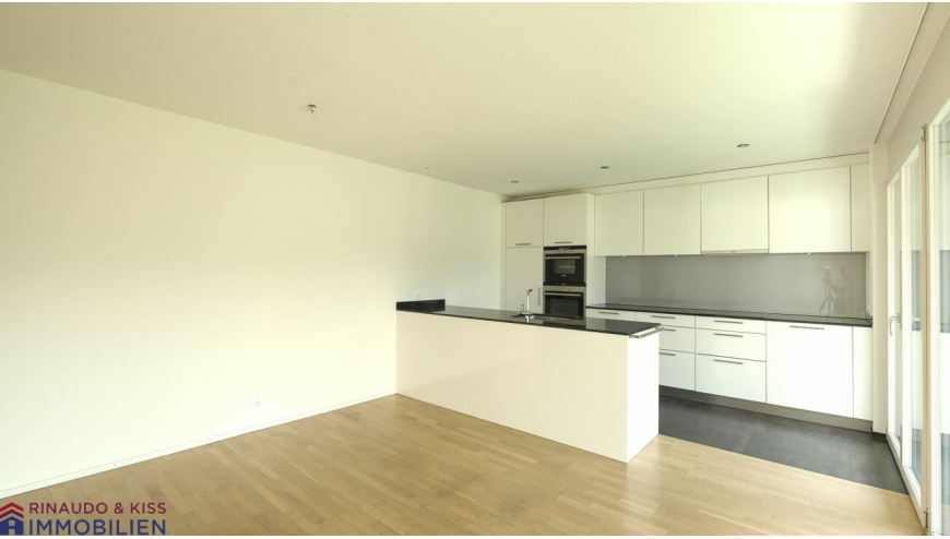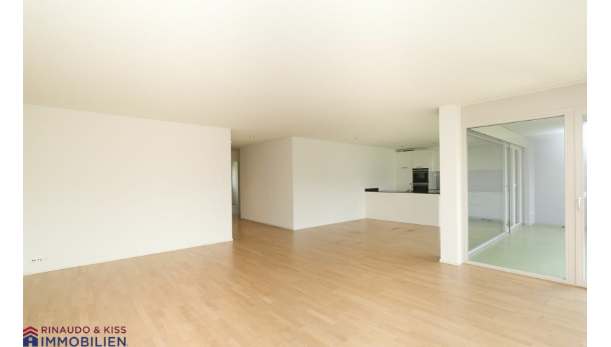 Das Entrée geht in den offenen Wohnbereich, bestehend aus Küche, Esszimmer und Wohnzimmer, über. Statt auf massive Wandflächen hat der Architekt auch hier auf grosse Fenster gesetzt, die den Wohnbereich optisch öffnen. Nur eine Küchenhalbinsel dient als visuelle Trennlinie zwischen den einzelnen Bereichen. Das schafft Raum und viel natürliches Licht. Vom Wohnbereich aus haben Sie 2 Zugänge zum grossen, gedeckten Balkon. Von hier aus geniessen Sie einen unverbaubaren Ausblick in die Grünzonen und profitieren von einer guten Besonnung. Hier können Sie die Sonne geniessen, grillieren und mit Freunden wunderbare Sommerabende verbringen. Dieser tolle Aussenbereich erweitert Ihren Wohnbereich nach draussen und bietet Ihnen auch einen angenehmen Rückzugsort zum Entspannen.