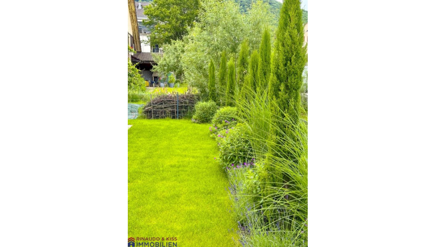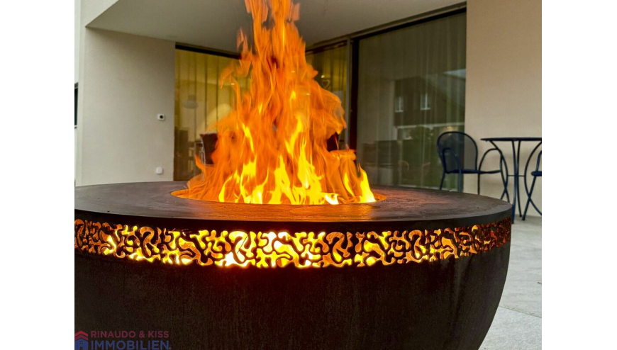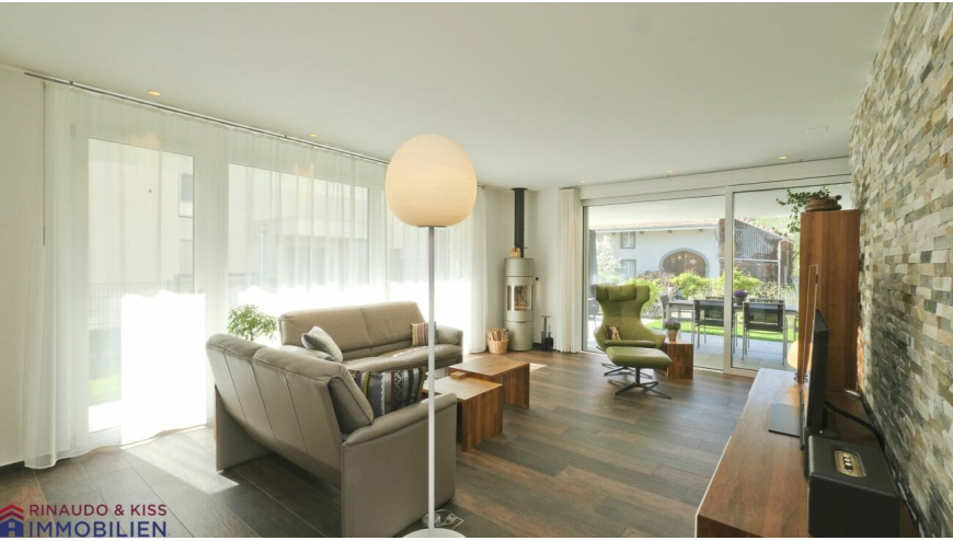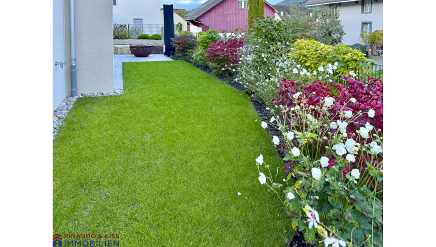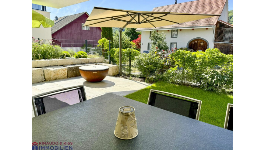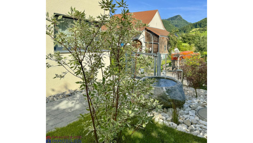 Die gedeckte Terrasse sowie den sonnigen Garten erreicht man sowohl über den Wohnbereich als auch über den Essbereich. Die grosse, gedeckte Terrasse ist eine wunderschöne Erweiterung des Wohnbereiches. Hier können Sie sich zurückziehen, relaxen und die Aussicht geniessen. Der Garten ist eine Grünoase mit wertvollen Extras (Brunnen aus Naturstein, Kalksteinmauer, Feuerstelle mit Grillfunktion etc.). Die Pflanzen wurden mit grosser Sorgfalt ausgesucht und stetig gepflegt.