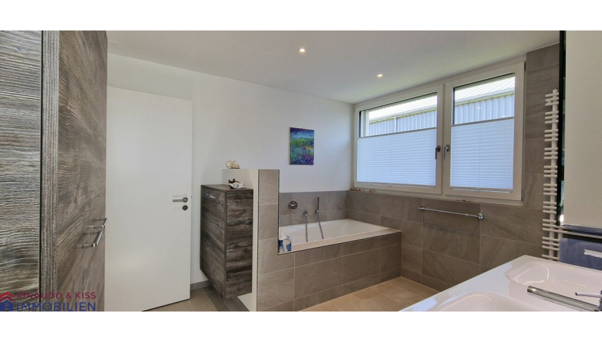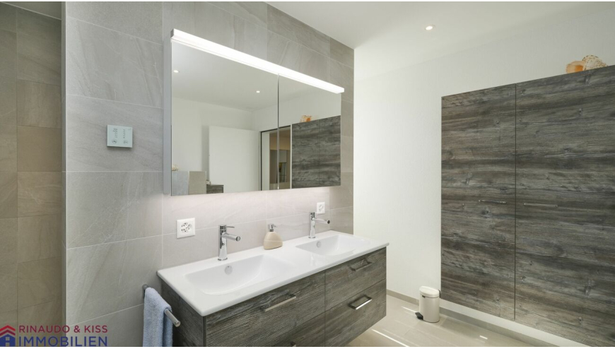- Elternbad OG: grosser Doppelwaschtisch mit beleuchtetem Spiegelschrank, Badewanne, begehbare Dusche, abgetrenntes WC, wandhängende Einbauschränke, Handtuchradiator