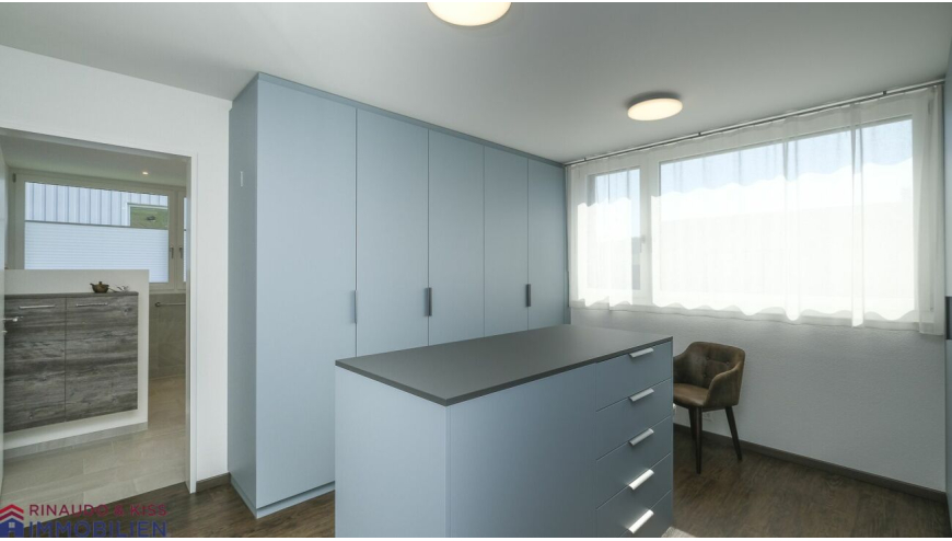 - Ankleide mit Einbauschränken und Insel mit doppelseitigen Schubladenelementen