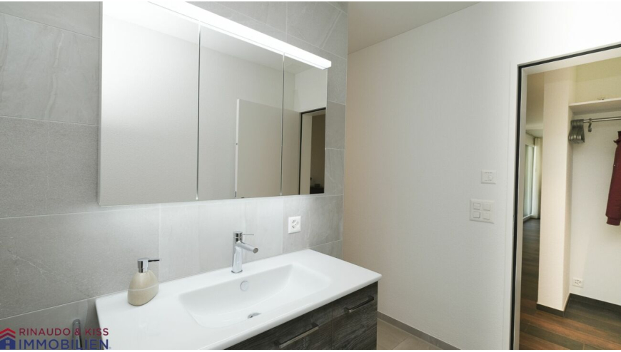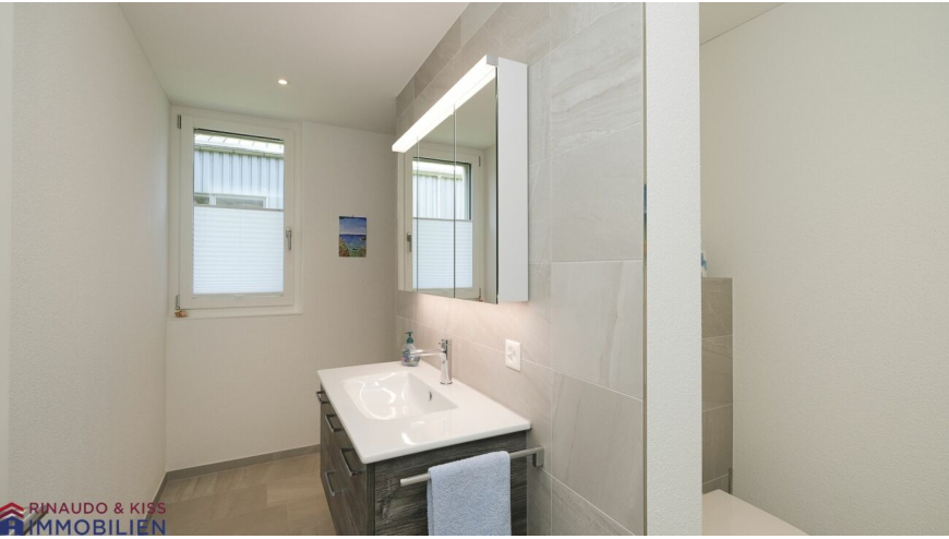 - Dusche OG: begehbare Dusche, Lavabo mit Unterschank, Spiegelschrank mit Beleuchtung, abgetrenntes WC